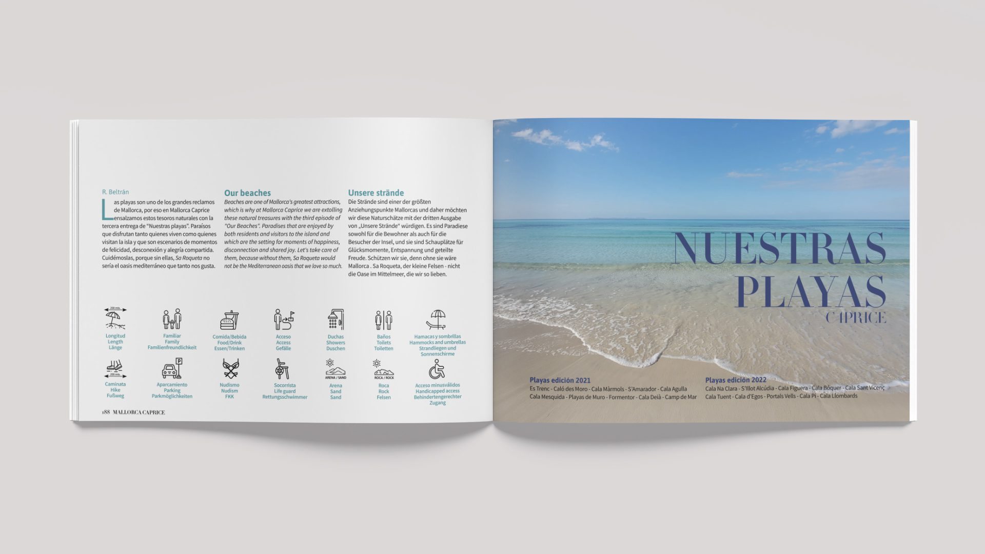 Mallorca Caprice 2023 – 2024 continues to show off the beauty of the Mallorcan coastline with a compilation of 10 beaches, in addition to the 20 published in the two previous editions. At the end of the guide, readers will discover a collection of spots where they can enjoy a refreshing swim in crystal-clear waters. Golf lovers will also find a complete list of golf courses in the Balearic Islands.