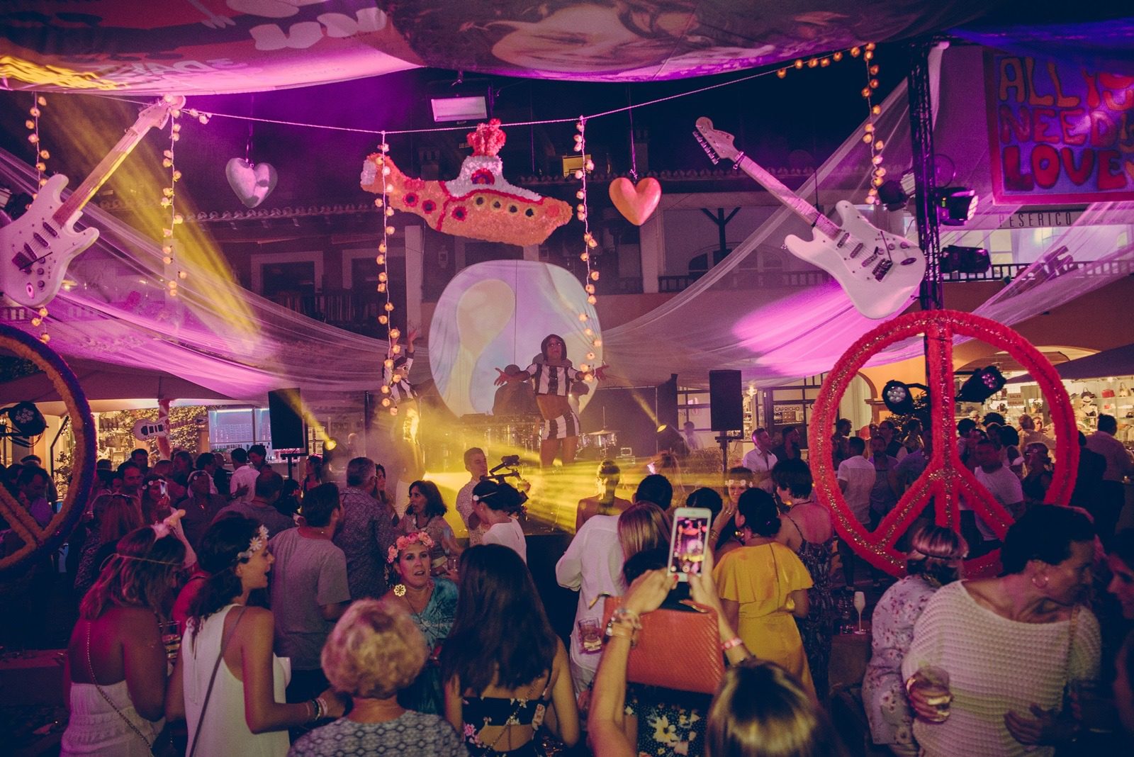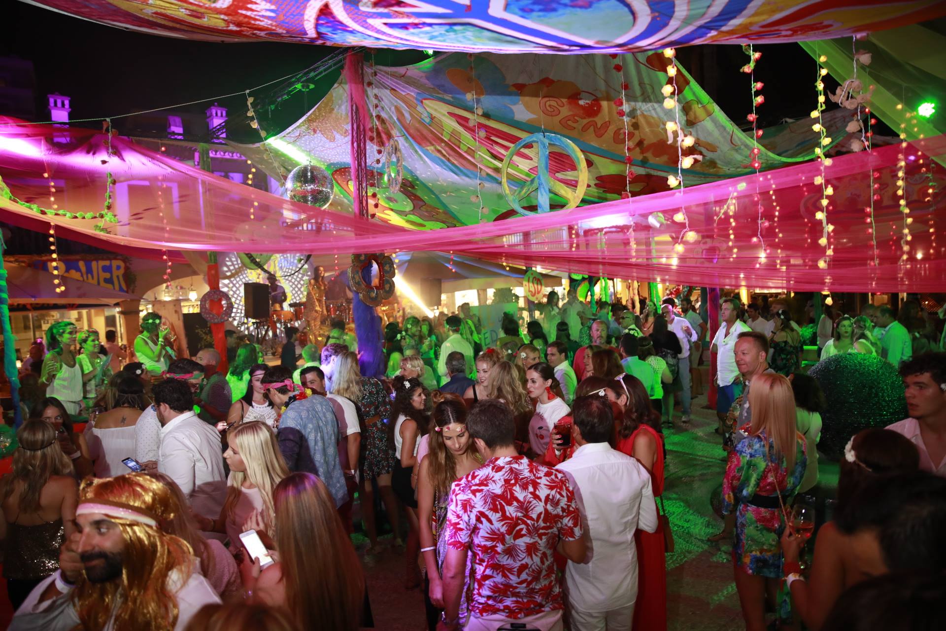 Durante la noche del 7 de julio, Puerto Portals se llena de estampados psicodélicos para recrear el ambiente hippie original que te traslada a los años 60 con la fiesta ‘Peace & Love’, dando así el pistoletazo de salida al verano en esta zona exclusiva de la isla.fiesta peace and love puerto portals